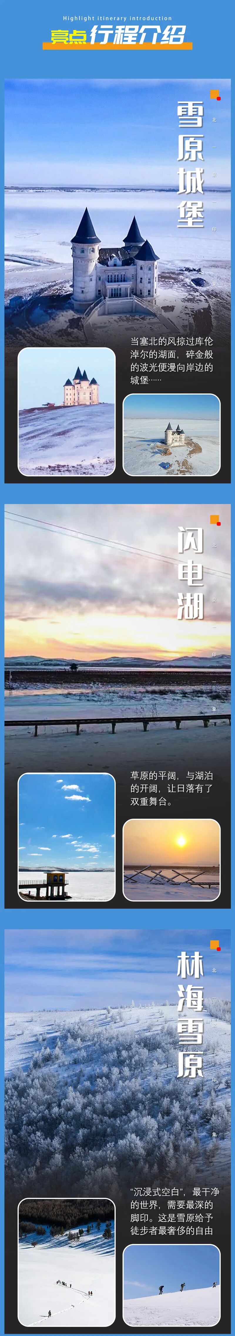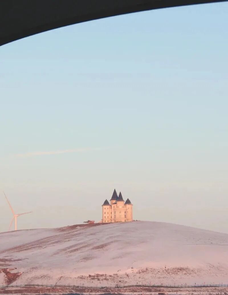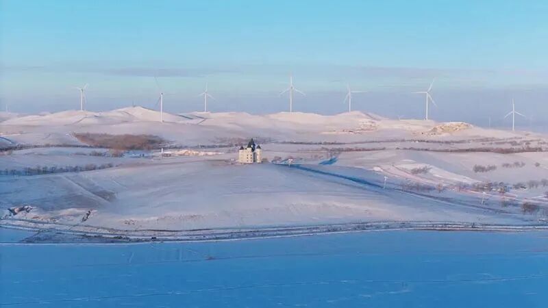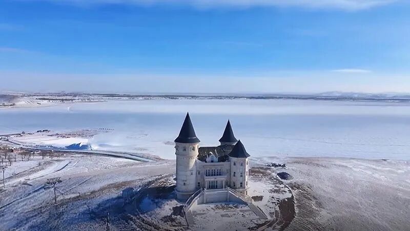 - 午餐后前往雪原城堡徒步起点,开始徒步。全程约6-8公里,爬升约150米。一路冬季雪原美景,登上坡顶,这里有一座欧式风格的蓝色建筑,宛如冬天里的童话城堡,坐落在高原湖泊和草原的环绕中,成为该地区一个独特的地标和摄影热点。