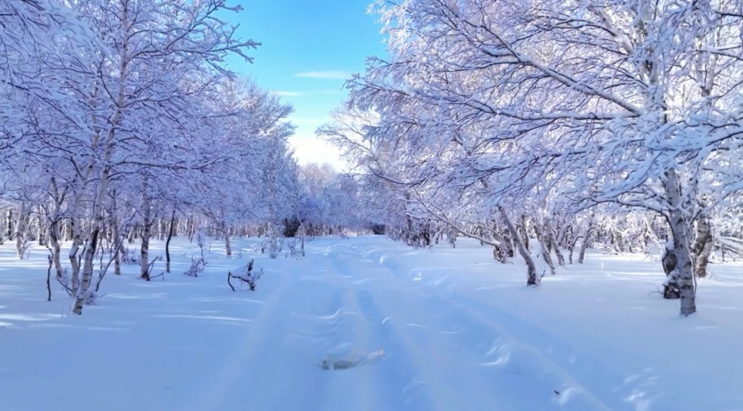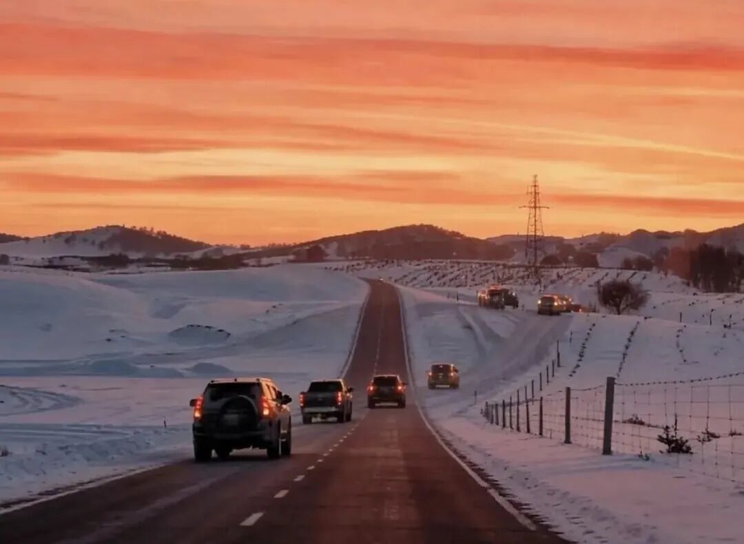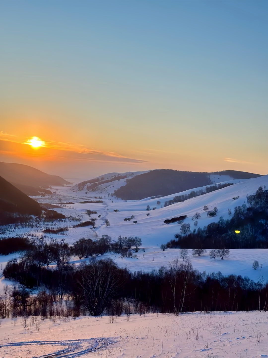 穿林海,跨雪原 雪浪推着车轮前行,白色统治了整个山岗。我们穿过白桦林褪色的签名,在积雪压弯的树枝下穿行。直到峰顶解开灰绒大氅,落日熔成滚烫的金箔——整座山岗缓缓沉入光的溶液。车辙印开始跟随霞光流淌,寂静铺开雪的画布,仿佛置身在列宾的油画中。